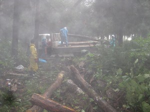 霧雨の中・・。 お山から間伐材の搬出でございます。
