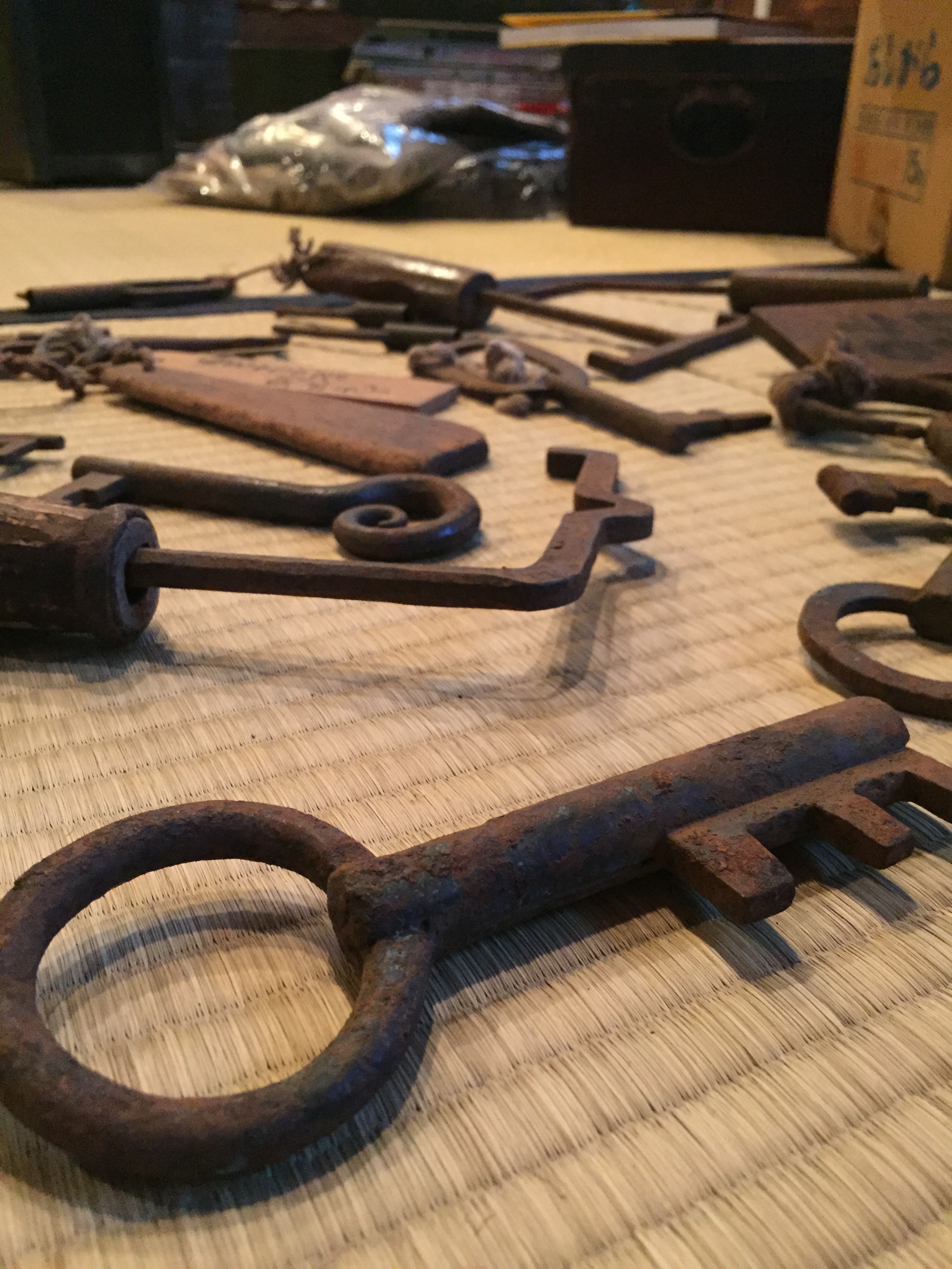 蔵戸の鍵 2016年3月5日 ブログ, 塩屋にあるちょっと古いもの 須坂の町のひな祭り・・。開催中でございます。 本年は「醤油蔵」・・3月中に別イベントにて使用予定につき、5年前まで飾っていた「お茶の間」に展示中でございます。 ご覧になりたい方、店員にお声がけくださいませ。 ということで・・。蔵の中・・お雛様の近くにしまっておいた、「蔵戸の鍵」もせっかくだから、蔵出し・・。 これでも、一部デス。色んな形があって面白いですよね・・。ヨメが一生懸命お雛様を並べている傍らで・・。私はカギをみてモエモエ・・すっかり邪魔モノ扱いでございました。 ちなみに・・。この中の数点は現役で使用されておりマス。