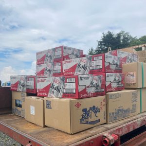 飲料やビール、食品、軽油のドラム缶。荷揚げに合わせて業者さんが次々と・・、とっても賑やかでした♪離発着予定時刻まで粘ったのですが、お届け先の山頂付近、視界不良にてヘリも基地で待機。見れずに残念です。