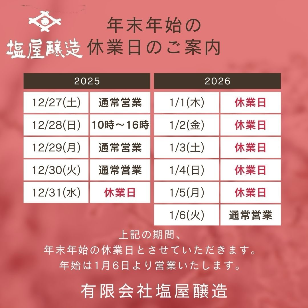 年末年始、お休みをいただきます。 2025年12月13日 塩屋からのお知らせ ここ30年、元旦以外は営業しておりました・・。 遠くからのお客様も大変多いので、大変心苦しいのですが、 年末年始、画像の通りお休みをいただきます。 塩屋の定番お味噌はイオンモール須坂1F「畑と台所 須坂市ブース」様にて販売いただいております。(無休)是非ご利用ください。 新年6日からの営業となります。 皆様のご来店をお待ち申し上げております。